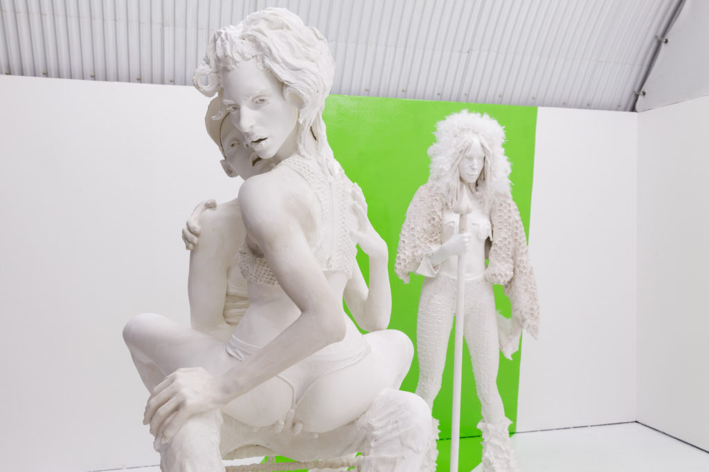 Large sculptures of young androgynous women crowd the space of the gallery, and challenge and exaggerate what the press release calls “classical sculptural tropes [which] evoke images of museum collections and historical archives.” The statues are not passive, but return our gaze.