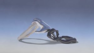 Leslie Kulesh‘s piece, ‘T.A.H. Temporary Autonomous Home (Survival Pillow Set)’ (2015) is made and therefore protected with PET film, a transparent polyester film which blocks the following waves: thermal, micro, and electro magnetic -as the materials list on Ashley Berlin’s website describes. There are two pillows. They are very close to each other, held together by a strap that makes them sit back to back. The foam pieces on their insides are visible – each granule.