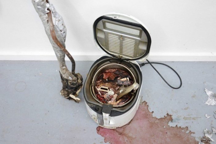 A broken pillow with strewn feathers sits in a corner next to a matrix of aluminium earplugs and wires that vaguely represent the shape of an arm. Another tree stump titled, ‘Could you juice me again? The colours are starting to fade’, sits in uncomfortable proximity to a steel box used to house toxic liquid. In another ‘unit’, a deep fryer-cum-garbage can is filled with steel tubing and a sneaker. Sculptural figures such as ‘Justin Bieber’ hang down above the scene and suggest a ritual that may have taken place. A red stain bleeds out onto the surrounding floor. The title, ‘I am you, Jun. I’m all you’ll ever need’, feels like an appropriated quote aimed towards a murdered lover. This sanitising of a reference steeped in malaise [through the theatrical nature of an art installation] is perhaps what gives the exhibition its disturbing undertone.