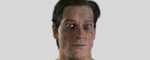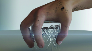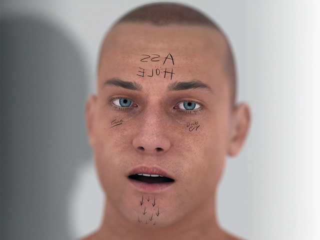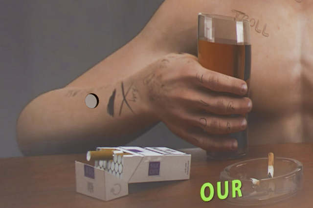 Ed Atkins is a multimedia artist whose primary means of expression is high-definition 3D animation. His strange, psychedelic and almost psychotic eponymous solo exhibition at the Serpentine uses a CGI avatar, ‘Dave’, as a performing protagonist who appears across multiple screens across the gallery. Dave, or dismembered parts of his body, is/are scattered throughout the show: a surprisingly bloodless head dropping down stairs, a piece of a torso mounted MDF board accompanied by poetry, a drunk resting on a table with a glass of booze and never-ending cigarette in hand – Dave is everywhere. His naked body appears with scrawled black marks that verge between poorly made tattoos and reminder notes. Dave is a bald, at times menacing, extreme drinker who revels in his own gratuitous self-effacing dialogue. His story is not narrated; his dialogue is without reason. He is an abstract fantastical character intent on creating a submersing and chaotic environment without any clear purpose.