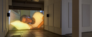 It is the same poster which is pinned above the bed of the character in the ‘Hisser’ video whose bed (and life) is on the brink of collapse into a sinkhole. Inside, the high definition video plays concurrently on two large projections and shows the inside of a man’s bedroom, which in turn tries to show us the inside of him. The scene takes place at night, windows are opened, curtains are shaken by the wind. The bed is sometimes empty, sometimes occupied by the man in the grip of the sadness, anxiety. Talking to himself, inhaling, panting; sometimes he tries to fall asleep, to calm his spirit. “I’m sorry, I didn’t know”, the digitised voiceover says.