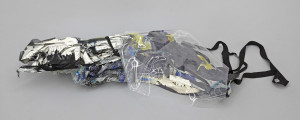 Nearby on the ground Tore Wallert’s Sponsored by Destiny (2015) stretches like the prostrate body of a barely discovered deep-sea creature, the kind that live in darkness and feed on oil. From this scrunchy package of toxic usables—plastic, epoxy, resin, fibreglass, permanent ink, polyester fabrics—ratchet straps snake out like the treacherous stinging tentacles of a Blue Bottle jellyfish, its nose points towards the wall where Clemence de La Tour du Pin’s two prints hang. Worked and layered, these textured prints bare leaf impressions like tattoos on skin, wearing their tread marks like bruises. One of the prints, Tean_Crimson Blood (2015), sheds its rusty crust onto the floor below, toxic like body fluids and powdery like uranium-enriched pollen.