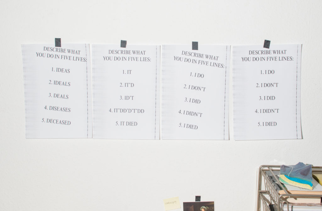 Plenty of Berlin galleries find refuge in apartment buildings; many echo a dilapidated pre-war opulence, and this one has a spiral staircase. From the mezzanine above I see Julie Grosche’s Zen out (2015) as a cheesy hipster-relic galaxy, something to dive into. At the bottom of the stairs is Sanctuary I-IV (2013), four digital prints on metallic paper by Hanne Lippard. Aesthetically they land somewhere between a periodic table and an eye chart. A poem of disjointed words and phrases, spaces inserted between the syllables, make me giddy. I feel her poetry as a gentle kind of beautified nausea.
