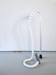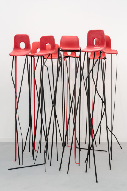 Placed with their back toward the gallery’s entrance, a body made from welded steel, wood, chain, castor called ‘Colonel Shanks’ is supported by an aluminium crutch. It could be its tail, a mutated phallus or a third leg. The object, designed to support injured humans, becomes a disfigured organ of power, pride and stability in this figurative animal-headed character. Its foam head looks as if it was torn into shape and has two steel horns sticking out of it. Placed on one of them is a bunch of plastic cherries, a kitsch remnant of mass production taking the place of nature in Darling’s world.