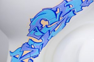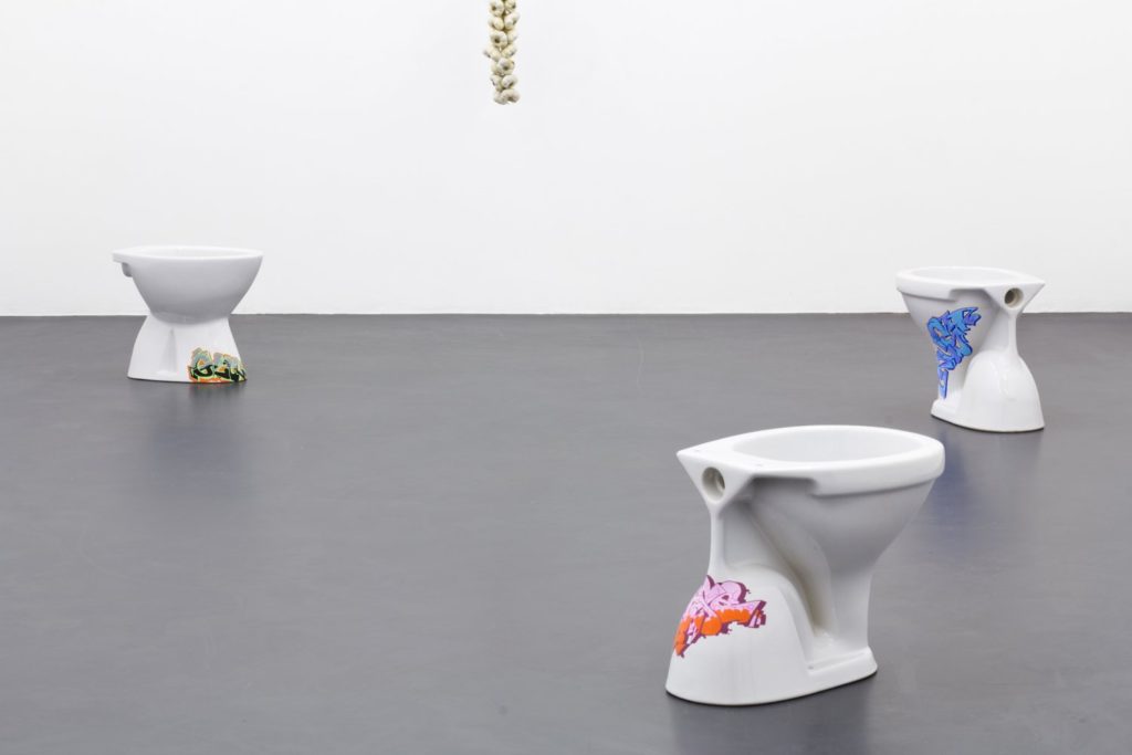 Four toilets are placed haphazardly around the space. Each titled ‘Toilet Piece’ (2015), the artists describe the medium as “Sanitary Ceramics” and each have been cleanly painted with pigment made to look like graffiti. Hanging above are the three ‘Garlic Piece’ series (2015), made of allium sativum (see: garlic) and bast fiber (also a part of the plant), hung on steel. In the adjacent room, ‘Wall piece’ (2015) takes up the majority of the space and is made using nitro-combination lacquer. The graffiti presents opposite the isolated and minimal ‘Soap/Sink Piece’ (2015).