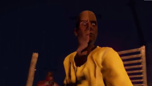 Of course the work, ‘Transdimensional Serpent’, relies heavily on the assured novelty value of new technology, but it does give some real moments of wonder. One highlight is when, inside the VR headset and looking up to see not the white roof of the tent but a host of silhouetted bodies far above as though floating on the surface of water. Without any narrative linking the scenes, it feels a little too much like an opportunity to show off a couple of cool set pieces: a dim alleyway in a menacing city gives way without warning to a desert landscape with figures dancing around a bonfire, or a rainforest to an empty grid.