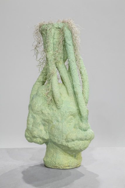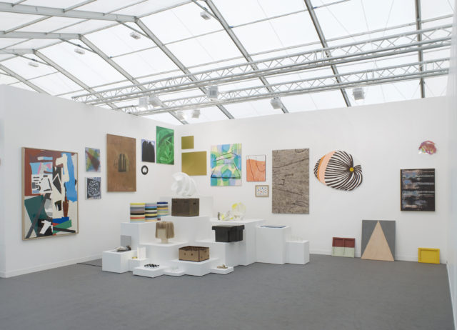 Certain single sculptures manage to cling onto some of their un-wordy strangeness, though in the too-bright and crammed booths it’s something of a struggle, like birds in the zoo. Helen Marten’s assemblage of objects appears like a cyber baby-buggy at Greene Naftali and, at 47 Canal, Anicka Yi’s infectious skin-fold lamps have their air of contagion somewhat neutered by the plush grey carpet.