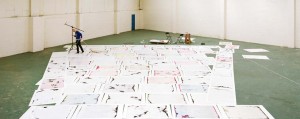 Travelling into Salford, the site of derelict buildings meets you head on. And it’s inevitable that the context of the performance, in the sense of the scale of the area to work in at the Regent Trading Estate, will play on the mind. Far from the extortionate rents of London, where artists cram into tight spaces, building in floors to accommodate their friends or bedrooms, room for expansive projects is a possibility. Yet, at the same time, this is a totally connected project, accessible from around the world, with a live feedback channel, that gives spectators a chance to comment on the process of production in front of their eyes. In response, Carlin shapes the layout of the work into a triangular ‘v’ that matches the perspective of one of the camera views, while the other peers over his shoulder as he works.