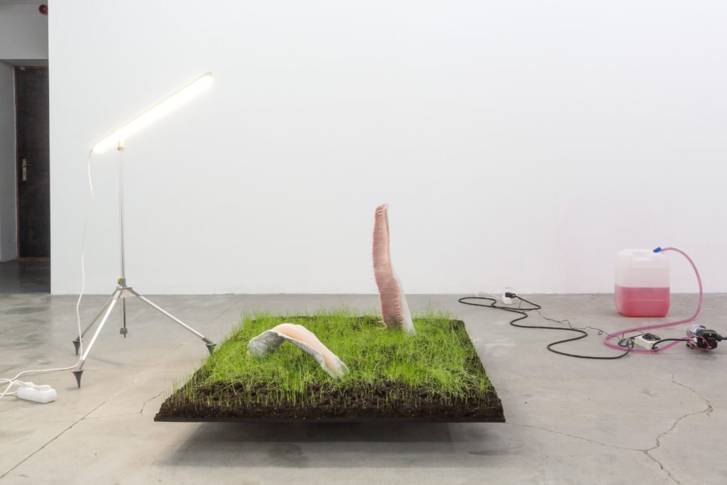 Blocks of green studio-grown ‘Global Grass’ lie on plywood squares on rollers across the gallery; unnatural nature fragmenting a concrete floor in clean cut grids. Curved synthetic conches made of plaster, resin, silicone, are lit-up by flourescent tubes on tripods that throw the synthetic pink and purple of their smooth and wavy hollows in sharp relief. It’s an overwhelmingly ice-cold sense of alienation that permeates, made all the more noxious by the leak of sprinkler in the corner spraying edible Rose food-colouring fed through a Cristallo PVC hose that’s meant to move food products. It’s stuff that’s made to be eaten but it looks like it could kill you.