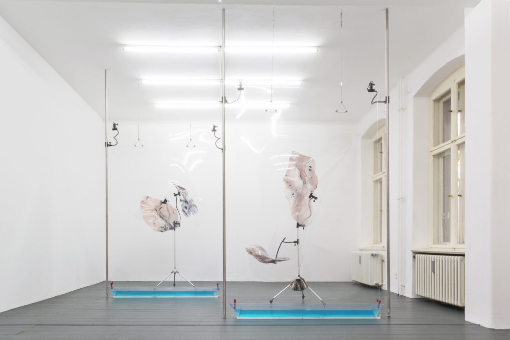 Pakui Hardware is the duo of artists Neringa Černiauskaitė and Ugnius Gelguda, whose heavily collaborative process is focused on the combination and integration of different materials. From ready-made industrial products to clay, or resin casts on natural grass, it’s their intentional combination of the organic with the man-made that drives them. Closing their most recent exhibition On Demand at Berlin’s Exile Gallery on July 15, the Lithuanian artists are fascinated by what they describe as “the transformation and interaction of materials, of various elements, rather than by some singular textures or products.” Writing via email in anticipation of their upcoming Creatures of Habit show at SIC Gallery, opening August 5, they’ll be presenting large-scale sculptures derived from their interest in robotic gear, built on their curiosity around observing, reading and testing, “how materials themselves perform, how they change under certain conditions or when different materials meet and interact with each other.”