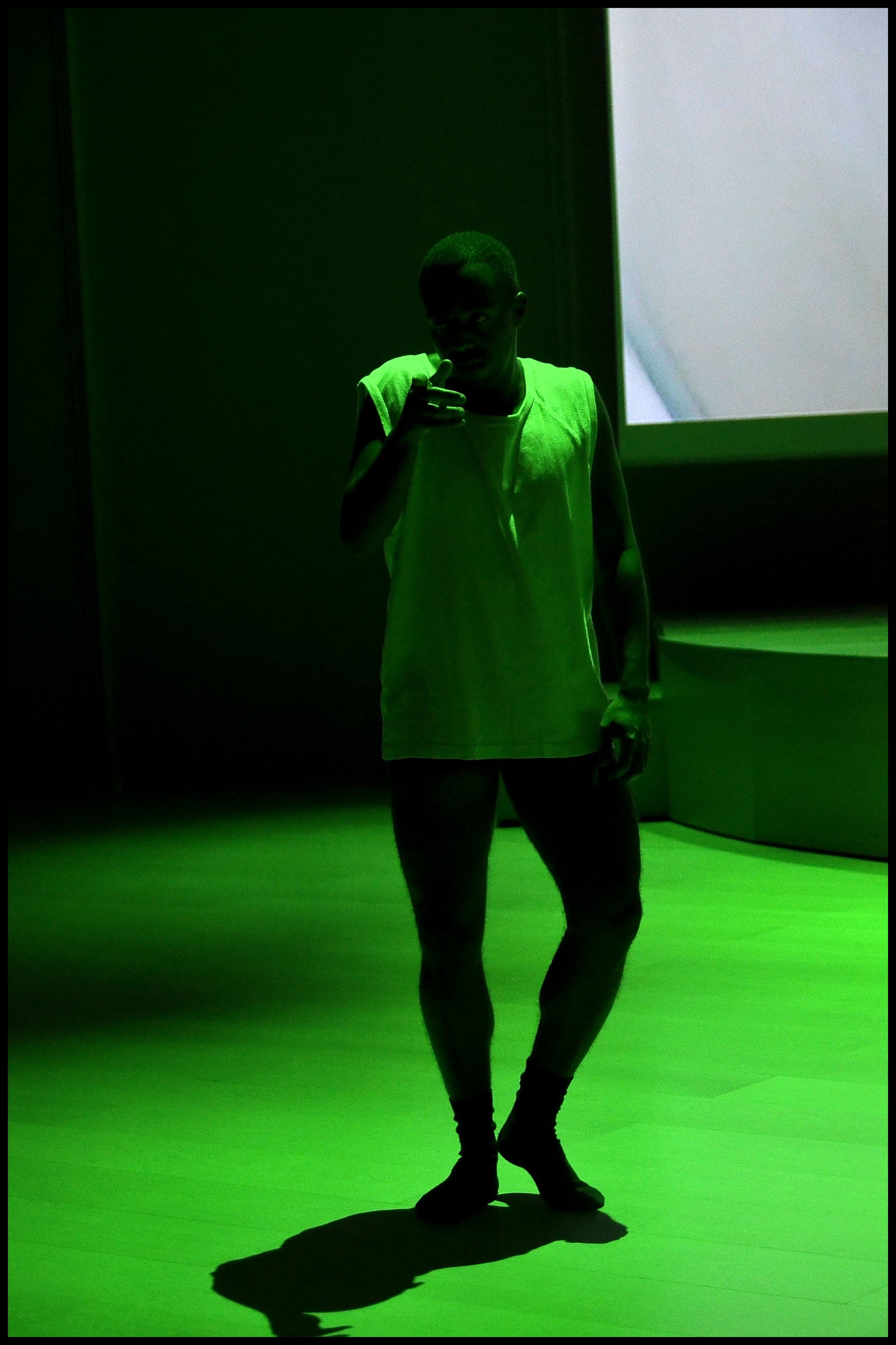 Paul Maheke enters the large auditorium of Santander’s cultural institution Botín Center casually, feet shuffling lightly along the floor against the backdrop of a trance-like soundtrack. Dressed only in boxer briefs, a white tank top and socks, the London-based artist feels out the space, moving between bodies in the audience and the stage area. Presented on April 17 as part of the Body Ecologies programme put together by Santander’s independent art space fluent, Maheke’s performance ‘A familiar familial place of confusion (Channel)’ (2018) follows one by Mary Hurrell on January 30, closing with another by Louisa Martin on May 26. The three-part series is the research project of curator Alejandro Alonso Diaz whose “conclusions appear in the form of experiences, gestures, intuitions and emotions, rather than via words and concepts.”