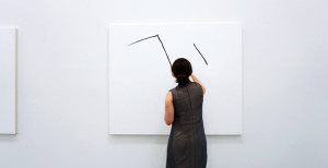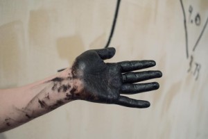 You could be forgiven for not noticing where the art begins. A strange and wonderful effect of the Wet Eyes exhibit at Meyohas, running November 20, 2015, to January 10, 2016, —an apartment gallery on the Upper East Side—strikes me on my second walk through the pieces. The works and space bleed into each other, jostling in a friendly way to determine the context for all the other art. The result is multiple and simultaneous contexts, a tapestry of meaning that shifts with the eyes’ movements. I start on the carpet past the kitchen, and notice how dirty it is. Shapes are scrawled into it. I find myself peering down, discovering my immersion in ‘rosie path; magic carpet’(2015)by Daniel Klaas Beckwith, a carpet dirtied and scrawled with symbols. The overall impression is of hieroglyphs chalked into a rug. A number of the images clearly represent objects –there is a sword and saw, for example –while others are more ambiguous. A crozier and cross shaped patch suggests traditional insignia of a bishop’s authority, a fascinating evocation of hierarchy and authority which lies only a few feet from another ambiguous image, one that looks a lot like the Zen enso, the incomplete circle representing totality, emptiness and infinity. After a few minutes of peering at the carpet I’m struck by my physical posture: crouched, bent, unconsciously remolded to decipher the world beneath my feet.