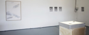 A pencil drawing on archival paper, gesso, emulsion, and spray paint made up Shiomitsu’s ‘Untitled (Range #2)’ (2015), which also seems to “push and pull” between its position, the material’s irrational self expressed with marks and scratches against the rationale inherent in the support and material – rectangular MDF and plywood boards. Perretta’s ‘5 percent’ (2015) HD video loops next to sandalwood incense in a pickle jar, typically used as a votive or gesture of devotion. van der Maaden’s ‘From a Head to a Head (clip)’ (2011) uses HD video documentation of a ritualistic ceremony of non-western tradition that jerks at the ambiguousness of the other artists’ works, positioning itself within well-defined tradition and history.