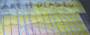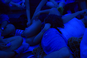From one thin bare mattress to the next, the exhibition winds through a series of simulated privacies. A text printed on silk, ‘Bind To’ (2014) by V4ULT’s Anna Mikkola and Hanna Nilsson, hangs, shower-curtain-like as an imperfect partition between pieces. Coming upon Jacent Varoym‘s ‘La Sieste (Abyssus Abyssum Invocat)’ (2014), a scene strewn with clothing, a half-drunk glass of wine and a plate of curry wurst, confronting and embarrassing you with these abject remnants of life. Visitors to the space sit on beds and talk in hushed tones. Everywhere you walk, you feel like you’re interrupting. You stop by Andrea Lukic‘s, ‘Who Will Let Her Hair Down When I Cannot Sing My Heart’ (2014) and poke the grimy nub of an earphone into your ear to discover the sound of fire crackling from the imitation flames of wood, pebbles and light bulbs. Though the intimacies are calculated, their simulated viscera is tangible.**