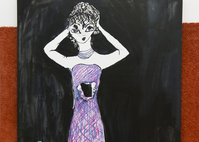 By blending these two personae together we get a successful amalgam of uninhibited creation and hyper-aware, selfie-culture works. The carpet emphasizes this warped reality of drawing the way through their inner child, as the viewer faces the wall-as-pile-floor-covering, evoking a feeling of being belly-down while standing up in a psychologist’s office. The shade of the carpet, too, is a vibrant blood orange. It feels nostalgic and evokes a simultaneous feeling of crawling through the entrails of the artist’s past.