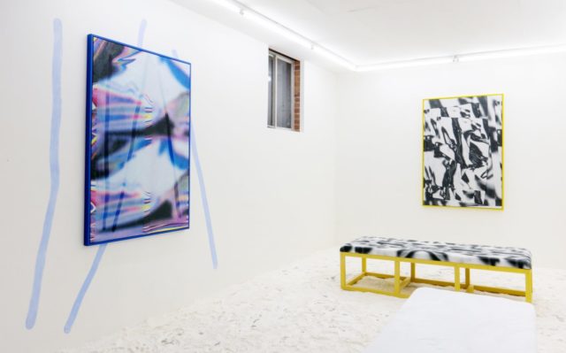 The New York-based artist deals with “fragmentation and movement through the confluence of digital and material processes”, visualised via the a trance like state induced by our existing hyper-mediated environments. Presenting a site-specific installation, sculpture and painting, modular furniture in the room allows for seated contemplation of wall-hung works, while a floor installation of a mysterious white powder captures movement throughout the space. The recorded traces of the viewer in the gallery mimics the gestures of Vieux’s own fingers across the surface of her airbrushed and matte gel paintings on digital manipulations of light printed on microfiber suede.