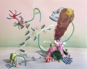 The press release comes with a text describing a seductive space at the ocean floor, revealed when the water recedes during the calm period before a tsunami hits. This “imagined ocean at low tide as their setting” features a series of 3D renderings, and photos the New York-based artist’s sculptures, paint, and found images, to depict yoga poses in plastic and Mermaids surrounded by the detritus of ‘Snapchat-like’ filters and special effects.