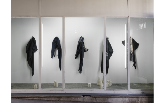 The gloves follow the design of female leather gloves, highlighted by the way they are constructed, whereas the trousers are tailored and made for men. The gloves speak for the feel of elegance whereas the trousers speak to a white collar workforce. The relationship between female-male and delicate-rough meet in the show to rethink notions of high class and aspirations, in a mutated form.