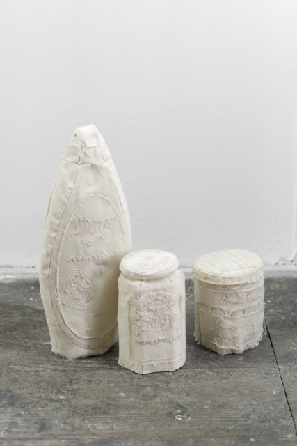 On the floor, there are containers of consumables like shower gels, hand wash and jam jars made of canvas. In order for such products to be consumed, they have to be spread on the skin like bread or a cracker. I was interested in the potential of spreading oneself into different classes. I saw a parallel in the gesture of tearing apart and reconfiguring a pair of tailored trousers with the blurring between higher and lower classes. **