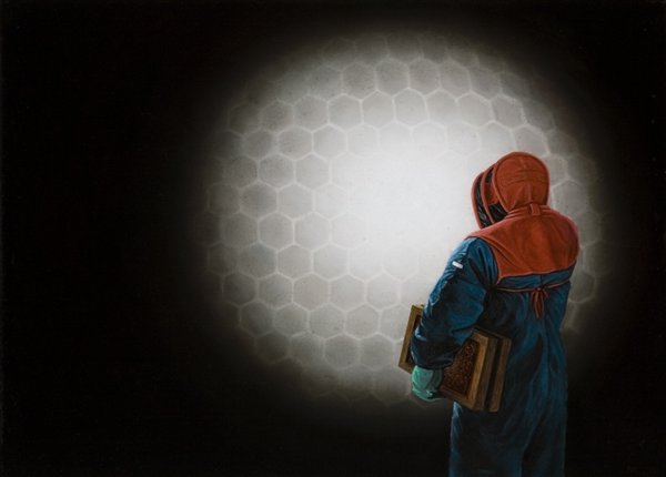 For this exhibition Stark has created a body of work that gravitates towards the centre of his preoccupations of the last three years. Stark’s paintings transcend time by navigating the historical, the contemporary and the futuristic. At once his content recalls the Flemish landscape painting of Patinir; the figure work of Zurbarán and Sassoferrato; and the minimal Modernism of Judd. We are invited to assume that these depictions are posited at some point in an imagined future…. post-apocalyptic  22nd century where beekpeepers have to wear flashy suits rather than standard white.