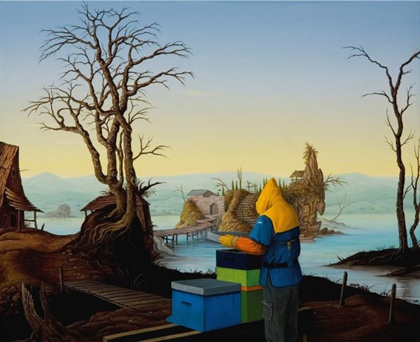 Colonies of beekeepers tend to their colonies of bees. Hooded and masked figures labour in the landscape in a collaborative enterprise to create liquid gold. Analogous to the intensive work of the artist, all are toiling here, all creating. Stark has also begun to provide more information. There is no doubt that we are exploring a utilitarian society consisting of communities inhabiting historic towers and fortifications; postmodern and prototype dwellings and units; and everyone and everything has its function.