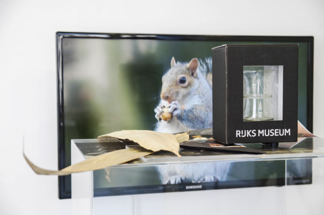 At the entrance of the exhibition, Plexiglas squares are stacked one on top of the other, transparent sheets, stones, spices, bamboo leaves and other things placed inside or around them. The same materials, motifs, information reappear throughout To Satisfy Algorithms/ Still Life with Asparagus. There is a souvenir 17th century glass replica from Amsterdam’s Rijkmuseumgift collection, as well as a tablecloth and napkins printed with Adriaen Coorte’s famous ‘Still Life with Asparagus’ from the same museum known for having digitised its entire collection –images of its artworks available online and in high resolution. On a wall behind the multi-layered sculpture, a TV screens test images that camera owners can upload online and present the special features and capabilities of their products. In the same way that painters of the Dutch Golden Age would demonstrate their skill through re-presenting a still life, so too does the amateur photographer.