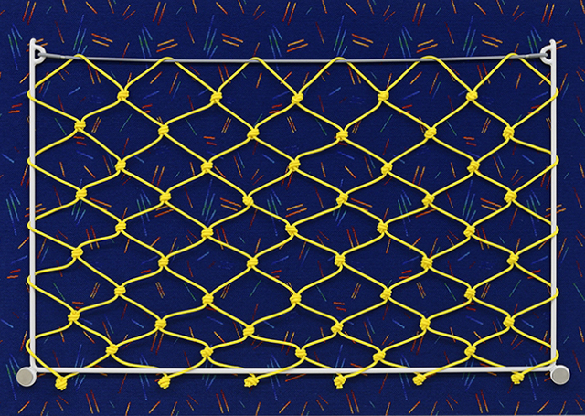 The other participating artists contribute their own takes on abstraction of reality. Yonatan Vinitsky exhibits a series of powder-coated coils (‘Ensemble Orientation Quick Jerky Movements Stop (Red.19.195.30)’) and one of rope-and-steel grids (‘Loose Ends (Blue)’). Alek O. creates a parasol fabric piece called ‘Tangram (Cat)’ as well as a two-part series of framed embroidery on canvas (‘Red’). Kenneth Alme shows a series of cotton canvas-and-acrylic paintings (‘Untitled’), and Razvan Boar creates an aluminum and powder paint installation of a two-dimensional pyramid of glasses. **