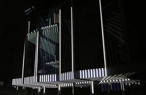 To close the evening, Julien Bayle performs ‘ALPHA’ (2014), an audio-visual show conducted on proprietary software synthesisers and sequencers, developed by the artist himself. It is sonically industrial, with driving kicks and crescendos of noise, but aesthetically minimal. Hypersensitive wireframe 3D geometries jitter and pulse in response to the sound, the projector often strobing along with the deep distorted kicks. Its simplicity and phenomenally tight synchronization creates a hypnotising and enveloping experience.