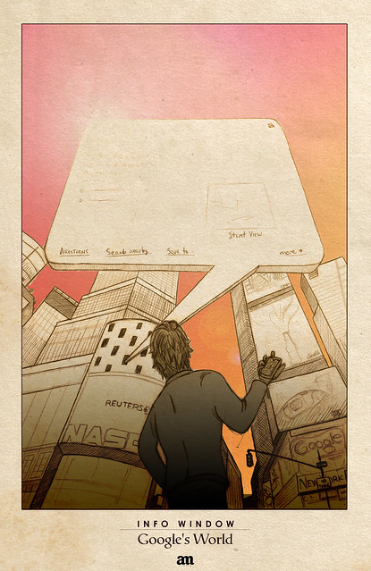 A few months ago we imagined what would be to live in a Google world, a few days ago Alejo Malia (a Spanish photographer & graphic illustrator) draw an even more exaggerated version of the Big G world… with big bold augmented reality Google pointers?