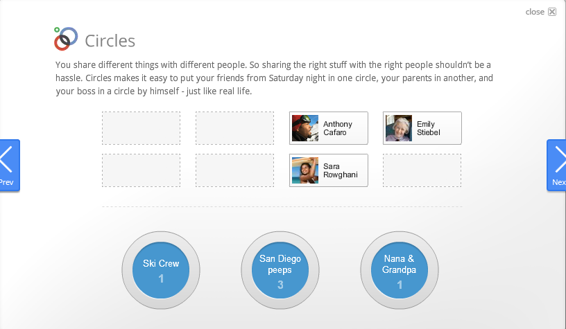 Circles is the core functionality allowing users select, organize & filter contacts for “optimal sharing” (nothing new here) from their Gmail & Google contact list (we imagine you can import facebook + twitter contacts too?).