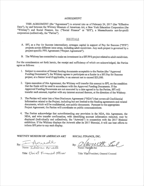 Cameron Rowland, ‘Public Money’ (2017) Institutional investment in Social Impact Bond. Courtesy the artist + ESSEX STREET, New York