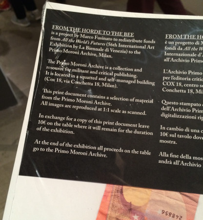 Having said this though, many works operate comfortably within the Das Kapital filter applied by Enwezor and work as deconstructions on ideas of exchange, value and labour. Most directly Isaac Julien’s two-channel video work ‘KAPITAL’ (2013) presents a public discussion between the artist and notable academic and lecturer on Marx, David Harvey. Marco Fusinato’s work ‘From the Horde to the Bee’ (2015) resulted from a residency in Milan with the Primo Moroni Archive of radical left-wing publishing. Fusinato places books containing scanned copies of resources from the archive around a large square table and, in exchange for ten euro thrown into the centre, visitors can take a copy away. Over the course of the biennale the pile of money, which is ultimately intended to end up donated to the archive, will grow, the stakes for its security slowly becoming higher. As such Fusinato plays out an experiment on the possibility of anarchism and grass roots self-organisation.