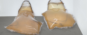 The nine sculptures, all titled either ‘Threat to Civilization’ or ‘Border/Boundary’, are themselves the cannibals; they have ingested the materials of other, former sculptures and lie listless on the floors of the gallery, their clear, plastic skins exposing their gluttony. “The round bellies of some are greedy and full, pregnant from autoerotic absorption,” Edmonson writes, while “[t]he latex skin of others is concave around the scaffolding of sharp and unnatural growths.” The consumption neither begins nor ends with my visit; the cannibalized parts transform their consumers from within, releasing rust and dye from their steel and fabric parts into the clear water, gradually turning it tawny and black throughout the duration of the exhibition.