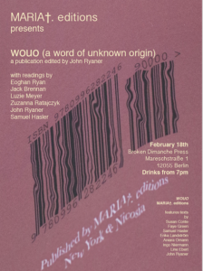 The MARIA† editions launch of WOUO, a publication edited by John Ryaner, is on at Berlin’s Broken Dimanche Press on February 18.