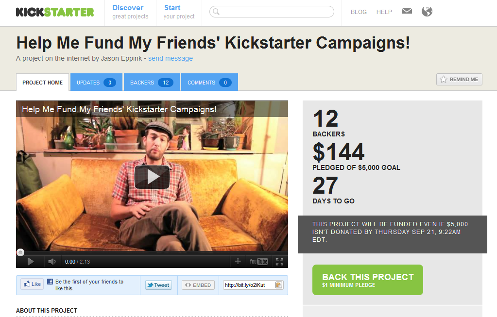 This is what happened to Diaspora earlier on this year. A project begun by four students at NYU’s Courant Institute who were dreaming of an “open” Facebook alternative (when this one was involved in a big mess of privacy issues). They were hoping to get 10K to start coding their so called “privacy aware, personally controlled, do-it-all distributed open source social network”. In the end thanks to this massive media support (Techcrunch, NYTimes, BBC….) & the anti-fb momentum they managed to raise more than 200K.