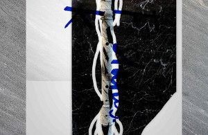 Another room upstairs, with floorboards and windows darkened by black tarpaulin, shows shifting viewpoints as visualised by landscapes fragmented and mirroring themselves in Baden Pailthorpe’s ‘MQ-9 Reaper’ (2014). The HD video animates a silver drone that looks like it’s made from mercury, a quicksilver image of an object that refracts and is fractured by its own reflection. A sea container suspended in the sky rotates above a scene of arid mountains. A lone bald man in trousers and a work shirt punches at the air.