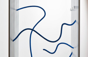 The works are largely wall based; ‘Throw That Mango’ and ‘Put Down That Mango’ offer another exercise in material cooption, using roofing sheet and a line to present a form evocative of the office space, cabling and a certain high-street electronics supplier’s logo. ‘Slow and Steady’ (2014) and ‘Coaching in Comfort’ (2014) constitute two main deviations from the rest, in colour and interaction with space, respectively.