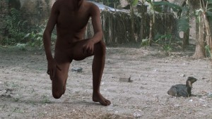 Rivas’s dancers move into centre stage as the film ends. They begin with a whisper and gradually start shouting. Their voices are speaking different words but their tone is in tandem. Like a stop button, a clap abruptly ends the incoherent noise and Sondra Perry‘s ‘My Twilight Zone Thing’ (2015-ongoing) video begins to play. Appropriated footage from episodes of The Twilight Zone occupy one screen and on the other is reenactments of this narrative in art studio, Recess, in New York. Impossible to watch both videos at the same time, Perry’s DIY remakes of characters who have entered over into the non representable, are narrated by a man from an early 60s sci-fi soundtrack. Naufus Ramirez-Figueroa‘s ‘Arquitectura Incremental’ (2015) also uses a nonsensical form of dry humour to straddle an uncomfortable and muted space. The performance video records a naked body housed under a five tier set of white architectural boxes stacked high on top of the torso. Dancing around through a circus act of balance, studio assistants are on hand if any fall off and need to be replaced. Three men in suits play a xylophone alongside, each body becoming a prop in depicting an immaterial narrative.