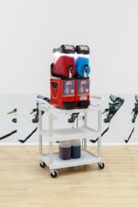 The script itself is sparse. Most of the dialogue is one-sided correspondence, like Scott’s letter to his deceased mother, and Lucy’s emails to a Florian who “never writes back.” Melodramatic monologues, “some day I’ll explain to you the way, the way you left me, like some royal child lost to the revolution”, offers a profound-sounding nonsense and sits adjacent to six artist readings, for which the play is an elaborate vehicle. Taking her place in a rocking chair built by Florian Auer out front, Hanne Lippard is the first to read. Her spoken astrological predictions, a successful performative gesture, strike a balance between content and delivery enabling her to top Scott, Lucy and the audience. The latter yawns, aweless, while handing out baguettes and saying, “this bookstore is boring.” Scott barrels ahead on his trajectory of progress and improvement: “I replaced your coffee maker with a strobe light.”