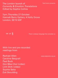 There’s no particular theme for the night offered by the event announcement but the poets have a considerable body of work between them. Including Collins’ position as co-editor of online quarterly tender journal and contributor –along with Allen, Lafarge and Maris –to The Best British Poetry 2015 collection edited by Emily Berry.