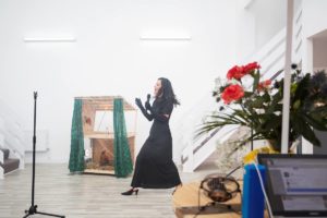 A lavender glow on the bottom edges of the screens draws the viewer’s eyes up to the light source which is a glowing ceiling tile and, despite the picturesque hue that saturates the space, inside it is what looks like dead cockroaches, clumps of hair and leaves, but the bugs are plastic and the hair synthetic. Maheke’s dance in the video runs in parallel to the semitransparent light box of objects overhead; in how lighting and music can turn a space into a place of gathering andaffinity, the synthetic hair as a cosmetic extension and assertion of identity. Despite appearing dead, there is a more positive take on transmutation through the symbol of the cockroach as resilient, and as animals that move and communicate in groups. Sewn onto the curtains in the space are sections of text that run across them, and though they remain still, motion is suggested in their content: “to read the waverin’ of the swarm as a resilient flicker, a gesture towards transformation.”