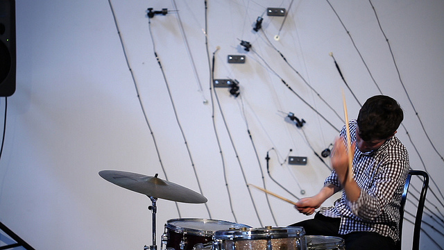 Eli Keszler, performing with the L-Carrier installation, Eyebeam, New York City, June 2012.