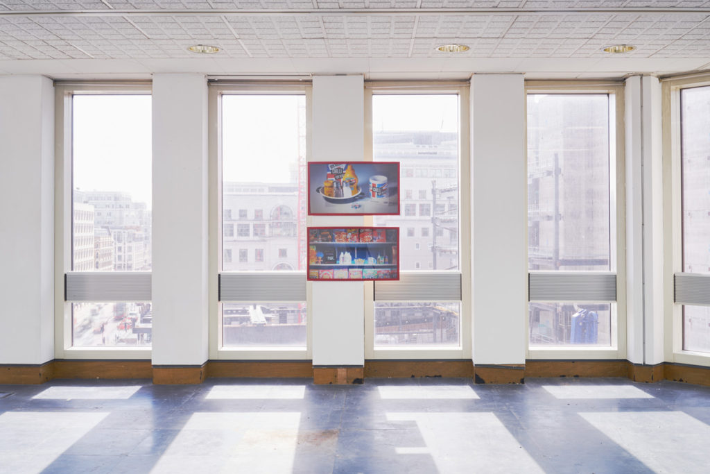 The gallery itself feels aesthetically rough around the edges, like an artist-led project space or live/work studio. The interior and images infect one another’s registers against a view of the city from the gallery’s third floor windows. IKEA desks and a bookshelf are used to delineate gallery from office. The room is lit with fluorescent tubes in recessed ceiling tiles that may have been upgraded daylight bulbs. The interior feels fashionable in its arbitrary features. As a cafe-bar might leave a section of unpainted drywall or exposed brick, the ex-city-centre office bares an environment fitting for Nettell’s show and her subjects. The Current Affairs press release refers to the function of these images as logos for a creative-cultural demographic and the ethical issues around them. Eating a gourmet burger at a chain that conspires with the police to trick and arrest suspected undocumented workers, and smashing up a Foxtons estate agents are both experiences rife with questions of privilege, access and community. These images, in their simplification as signs, critique the viewer demographic and their brand of judgement but do so from within the safe space of a young, successful, commercial gallery where these critiques are the artist’s content and commodity.