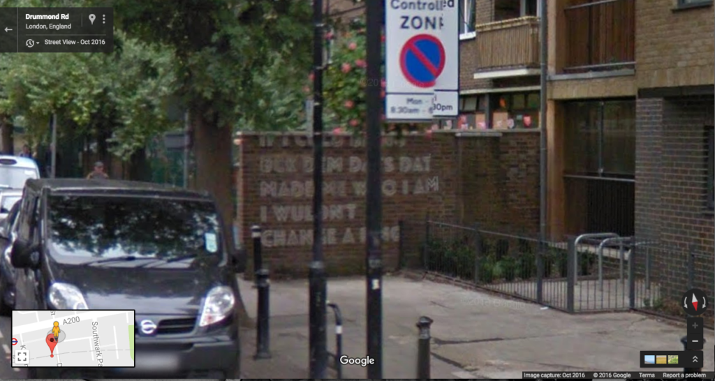 Looking at the wall now on Google street view, the text reads “IF I CULD BRING BCK DEM DAYS DAT MADE ME WHO I AM I WULDNT CHANGE A FING.” Re-authored by the development as something in public view, its function and intention is a skewed addition to the expected paving, flowerbeds and bike racks that one would find in the yard of an inner-city new development. The text wall, in its urban authenticity, violently co-opts multiple layers of identity politics and signification; of the artist’s intent and co-option of local young residents’ re-coding of song lyrics, Wiley’s artistic influence within London’s music and youth cultures and the developers mis-identification. It’s an interesting situation that merges artistic capital into property and re-development with the aim to quickly and efficiently produce something real and experiential but without any specific relation to the context or its histories. An empty slogan for a nonspecific relationship to community, the wall is forced into its second life as nostalgia, with the propagandist sentiment of a ‘Keep Calm and Carry On’ poster.