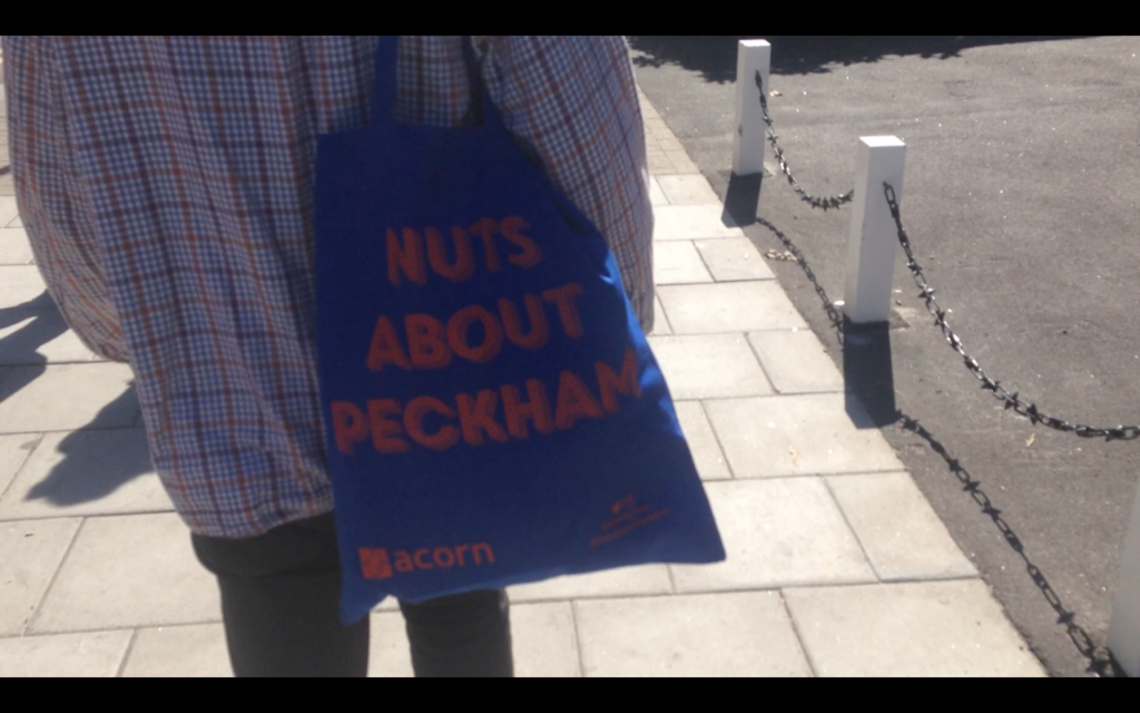 A blue canvas tote reads ‘Nuts About Peckham’in red screen print. It swings from side to side with each step forward. Keys clink against a phone or something similar inside. I’m here as a tourist, more so than when I lived here as a student, and I’m filming a man in front of me walking up the high street, because both of us are carrying the same blue bag. Today is the inaugural Peckham Festival, running September 8 to 11, sponsored by local Acorn Estate Agents, whose free merchandise I am paying for in my co-opted labor as an ad campaign. It’s a weekend-long event across new and established businesses, creative organisations, community groups, restaurants and bars in the south-east London suburb. The bags contain flyers and a stapled, colour printout of some of Acorn’s properties available to buy or let. This kind of strategic marketing hangs awkwardly over a 20-something-artist in Peckham’s shoulder. A heavy token for the indirect cultural contribution to the market value of property in the area. In the past decade especially, the largely working-class multicultural area of Peckham has gained international recognition within the art world and beyond for its creative output. With a range of practices, motivations and organisational models, young artists have moved to the area with increasing frequency to forge new localised networks nurtured by nearby educational institutions; Camberwell College of Art and Goldsmiths University. A previously neglected inner London suburb, Peckham was known to a British television audience through two brothers’ unsuccessful economic ambitions in Only Fools And Horses which ran on the BBC until 1991.Its early-noughties realities of cheap rent, vacant commercial buildings and flexible private landlords offered creatives access to Peckham’s property rental market.