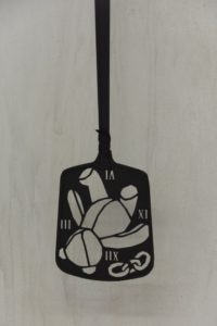 ‘My Mirror My Cage’ (2016) is a recognisable artefact — a white leather recliner. Situated in an otherwise lonely corner of the gallery, it is punctured in a number of places by thin steel rods. The rods, though not overtly violent, render the chair unusable — making it impossible for someone to sit comfortably in it, stripping the sculpture of its utilitarian associations. Reflecting this piece are two sculptural pieces, drilled directly into the carpet. ‘Ghost Rack I & II’ (2016) exist as delicate yet immovable tree-like fixtures. Off several protruding metal ‘arms’ hang the taxidermy bodies of white mice, caught in moments of suspenseful distress as they appear to hang on for dear life. Also mirroring below are  rodent-sized, blown glass sculptures with similar formal qualities to the dead mice, but abstracted beyond confident recognition.
