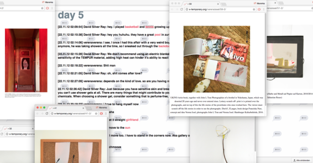 Run by Marenka Krasomil, the online space supports the process stage of developing concepts and ideas, with an aim to “have fun.” They are currently hosting ‘[Middle Class]‘ (2016) by Andrew de Freitas and the current resident is Lina Hermsdorf. Past projects include Verena Issel‘s chat-based online soap opera exploring voyeurism and self-profiling, and Balz Isler‘s daily online drawings. After the residency is finished, the work is taken down and exists on in screenshot format.