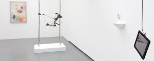 Left-right: Timur Si-Qin, ‘Deliver me from dipolar spirits’ (2014); Neil Beloufa, ‘Kempinski’ video (2007). Fulfilment Centre installation view at The Sunday Painter (2014). Image courtesy the gallery.