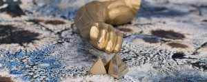 The most dynamic, immediate work, though, is that of Julie Born-Schwartz, whose mixed media installation ‘I had an expectation that it would fade’ creeps off the wall and across the space, its disembodied arm taking agency as it claws out of nothingness. Formed of hard unfeeling gold and peculiarly skinless, the arm is presented on a backdrop of what looks like skin cells under a microscope, digitally rendered and printed on paper that spills from wall to floor. The fingertips touch lightly on a pyramid; the hand reaching for spirituality, or at least a symbol of it.