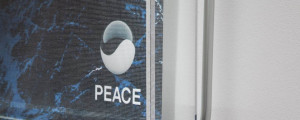 The t-shirt’s positioning suggests the exact outline of the “perfect” male torso, sculpted in seams; opposite, Si-Qin’s ‘Deliver me from dipolar spirits’ counter-acts with an extreme close-up of a man’s chest and stomach, all muscly and hair-free. In Si-Qin’s work, the torso (which is displayed on his staple aluminium X-banner stand that could have been taken straight from the conference room) is next to a mirror-image of a woman’s face, airbrushed into the uncanny valley and framed by her delicately manicured hands. In Si-Qin’s installation, “dipolar” qualities are both separate from and inherent to one another, and so these gender ideals are presented together, both propping prop up the flipside of a display promoting “PEACE” with the star and crescent and crucifix of a Chinese yin and yang symbol. The fusion is crude, as is the commodification of Eastern and religious philosophies. This piece more than any other walks the “fine line between cynicism and sincerity” referred to in the Fulfilment Centre press release, directly appropriating its object of critique to form the crux of the space, the other pieces orbiting.